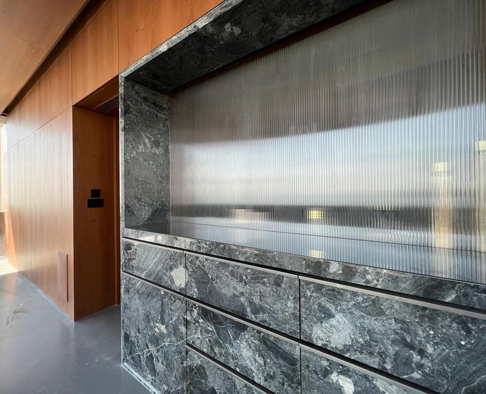 This boutique office features a distinct geometric design that mirrors the brand identity. The corrugated ceiling, combined with a linear flooring pattern, accentuates the office's depth, while the use of glass maintains the office's transparency.