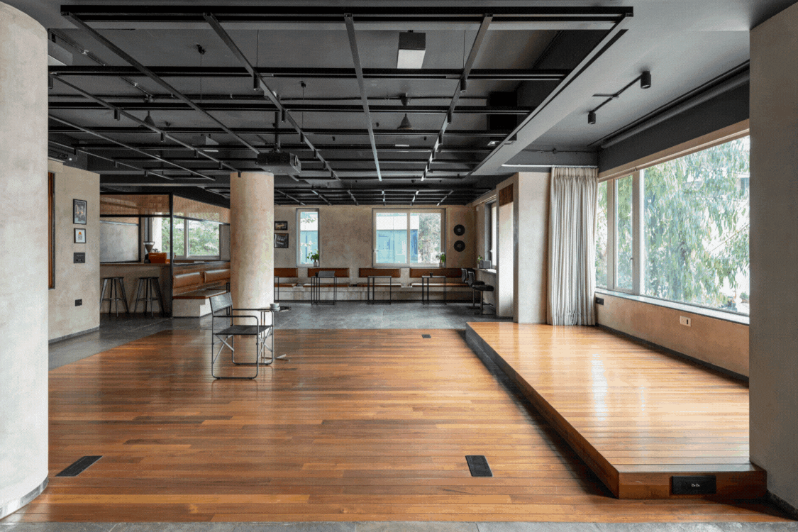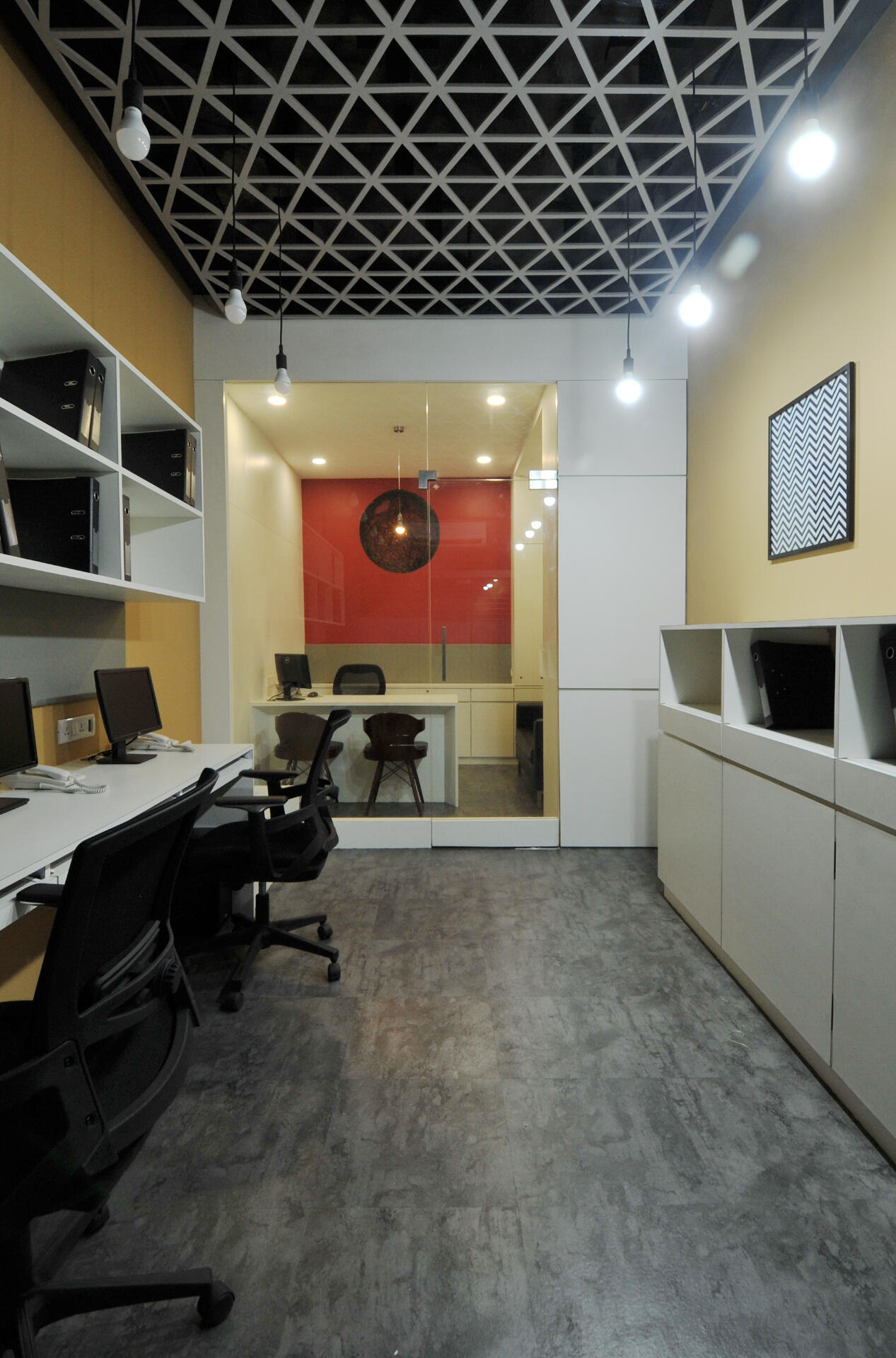 A distinctive design solution for a young brand was offered by means of Cabin volumes, strong geometric suspended light feature with colour therapy in raw industrial setup and subdued outer volume in black colour and stone. Played with basic geometric forms to achieve a proportionate product. Keeping the Industrial feel, the space was give a breather with planned landscaping.
