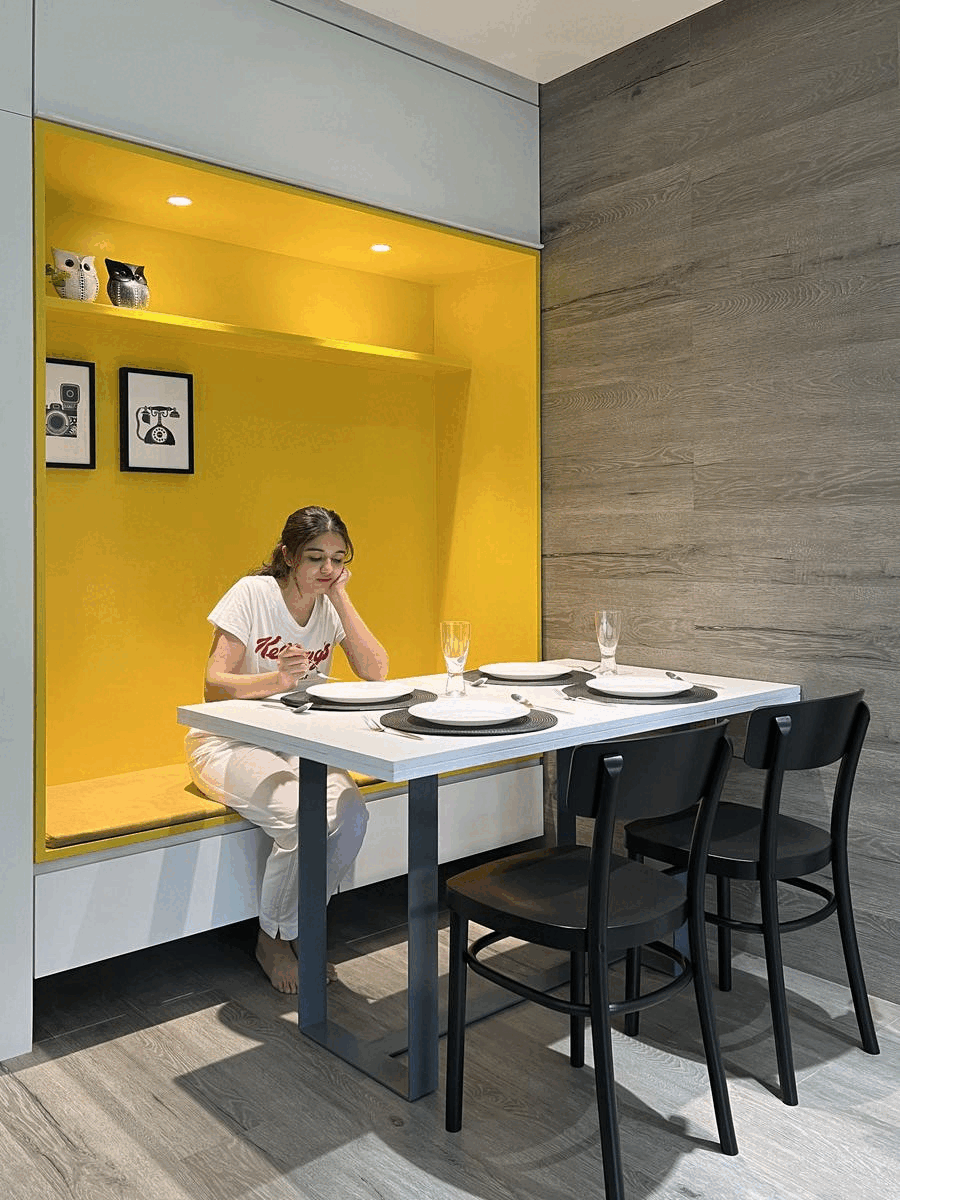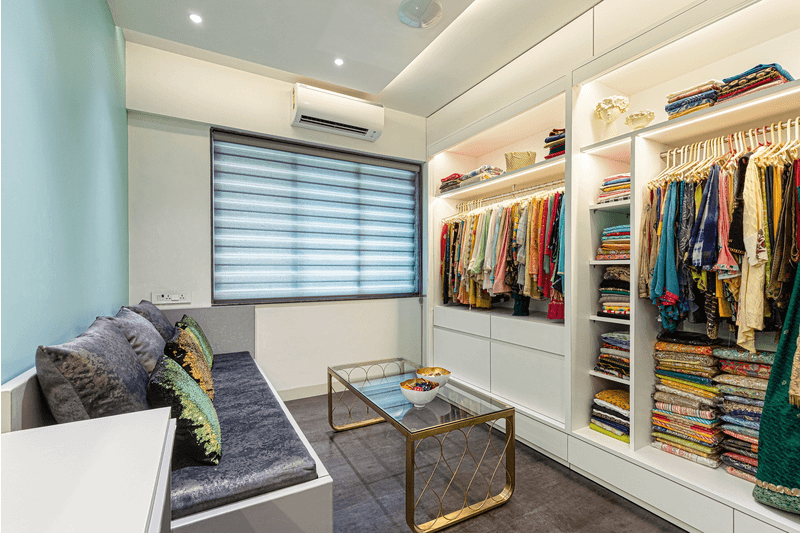 A part of house designed to a perfect Boutique set up in pastal color tones with rustic floor and glinting accessories reflecting brand identity. The inviting design allows the visitors to take their time and feel comfortable while splurging in Shimmer Collection. This lively space also doubles up as a Guest Bedroom with element of surprise. The color tunable lights, pull out bed & hidden roller blinds do the transformation of a boutique into a bedroom.