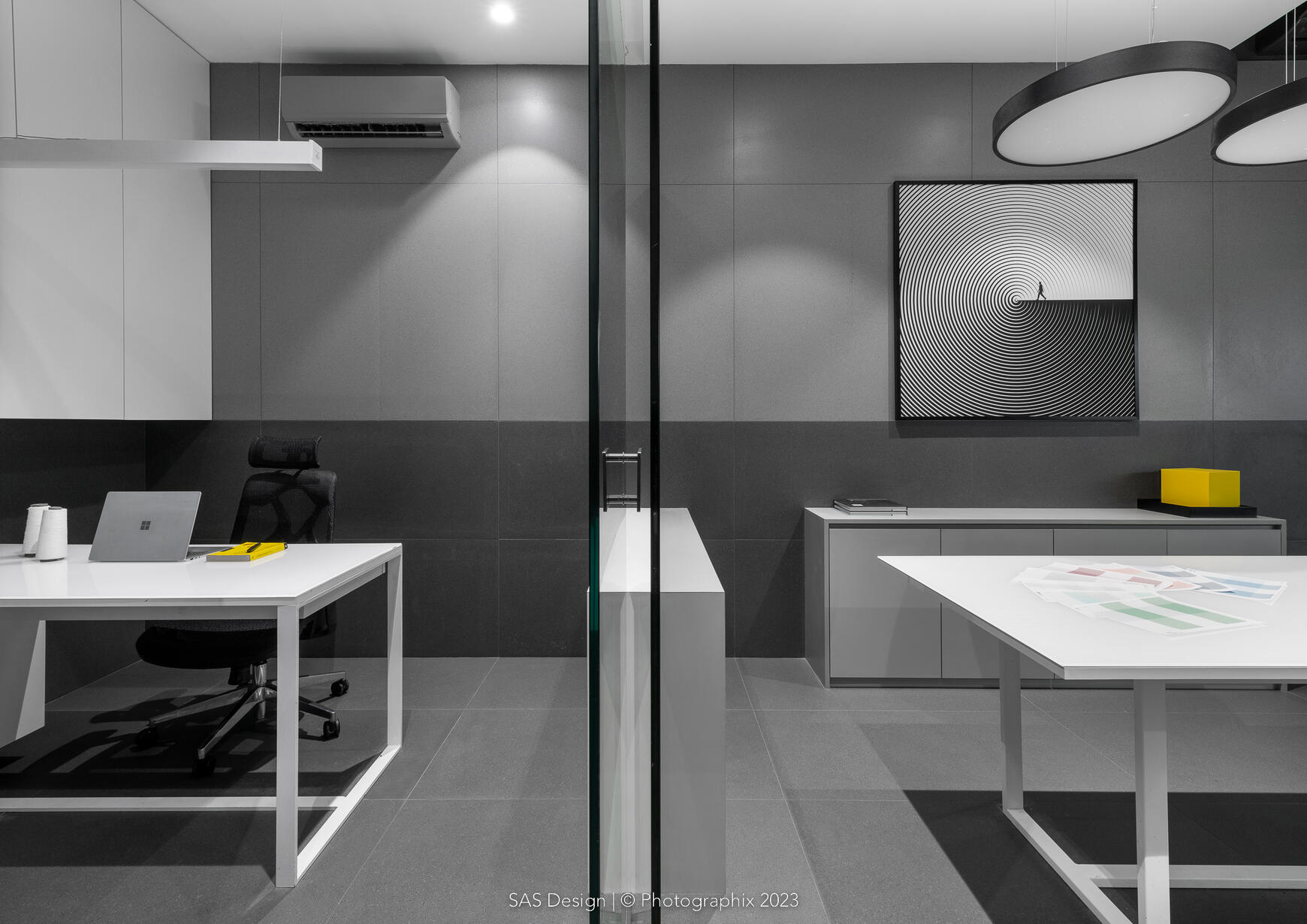 An inspiring space for designers who needed to focus just on creativity for a textile industrialist, was achieved with keeping monochrome color palate, where the textiles would get neutral background to standout. Adhering to the client's brie, a focused space was planned technically right and atmospherically correct !