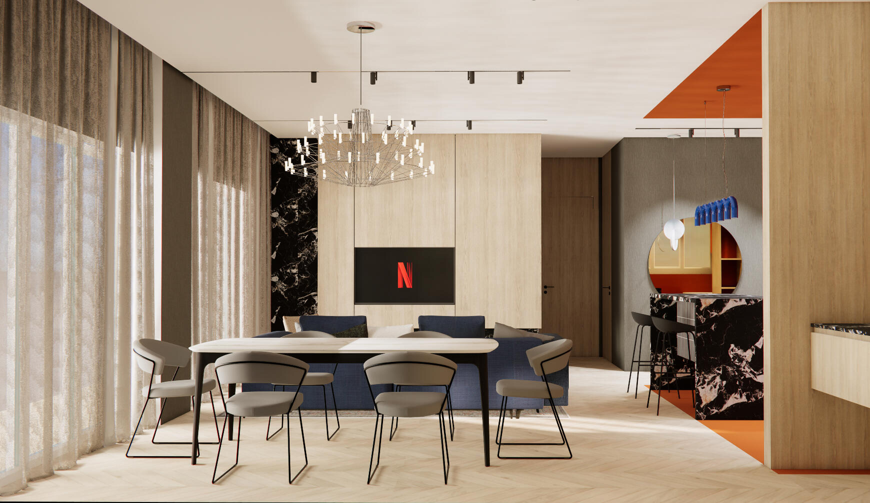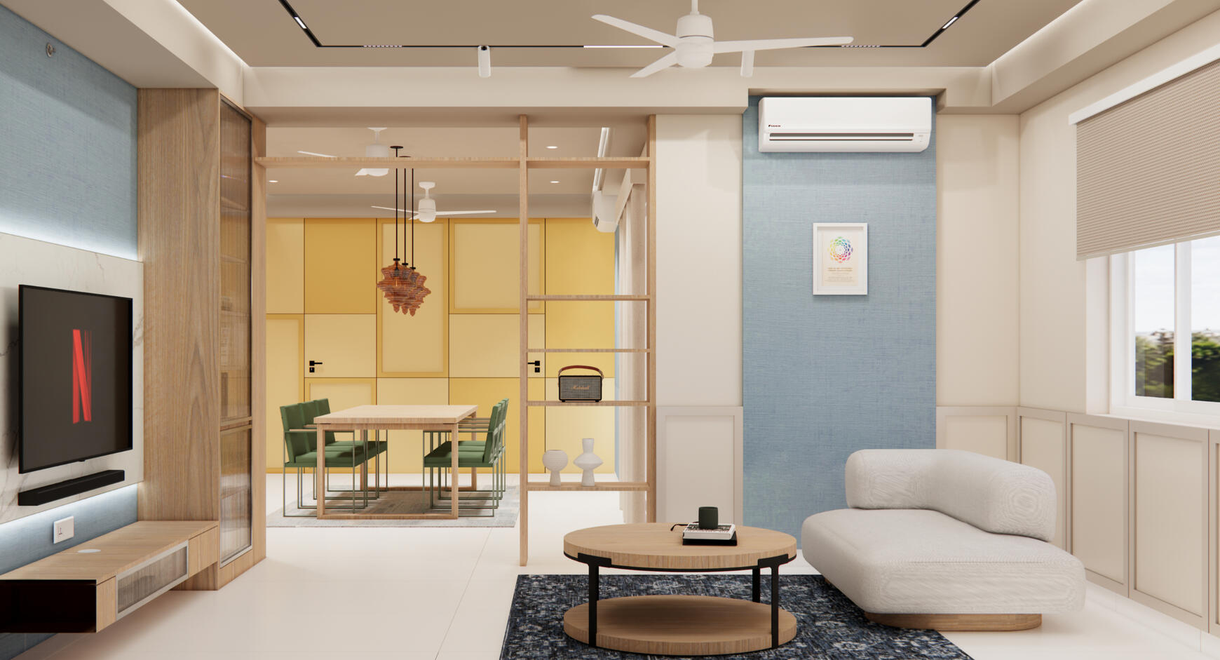 A 2 bhk apartment designed for an entrepreneur who wished for an upscale living with simplistic Scandinavian styled interiors. Overall approach was to keep the Norwegian color palette with very stylish furniture and lighting. Overall bright and clutter free space with wooden base tile and little splash of pop colors. The cement wall is created for as the main backdrop for living and allows to express the purity of space.