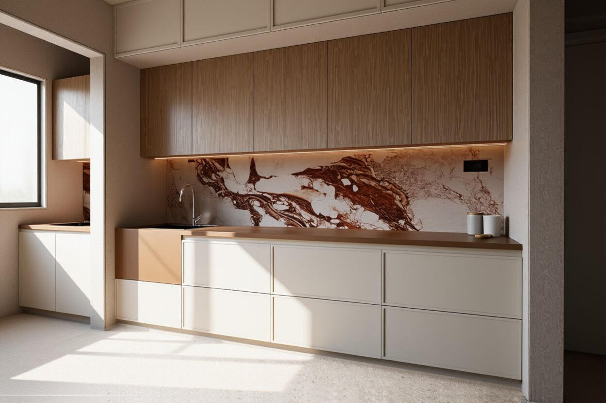 Minimalist decor merges with abstract design style in this 1500sq.ft. stylish expanse. Innovative use of materials creates a warm, elegant ambience that captures the soul of the space.