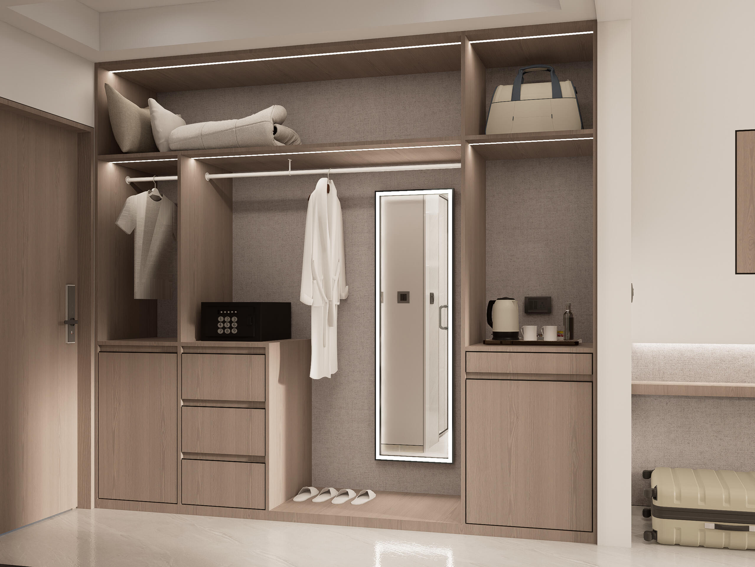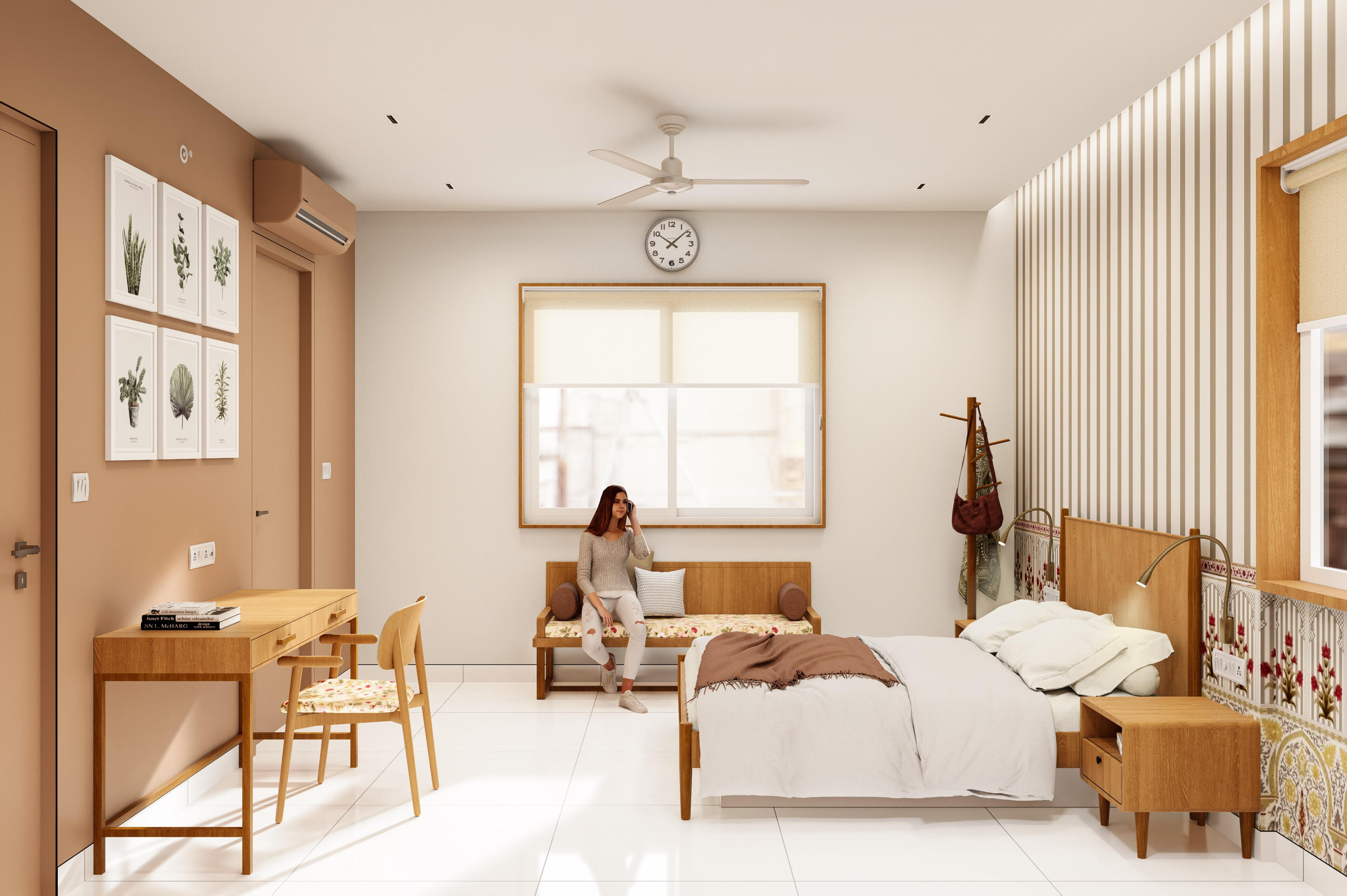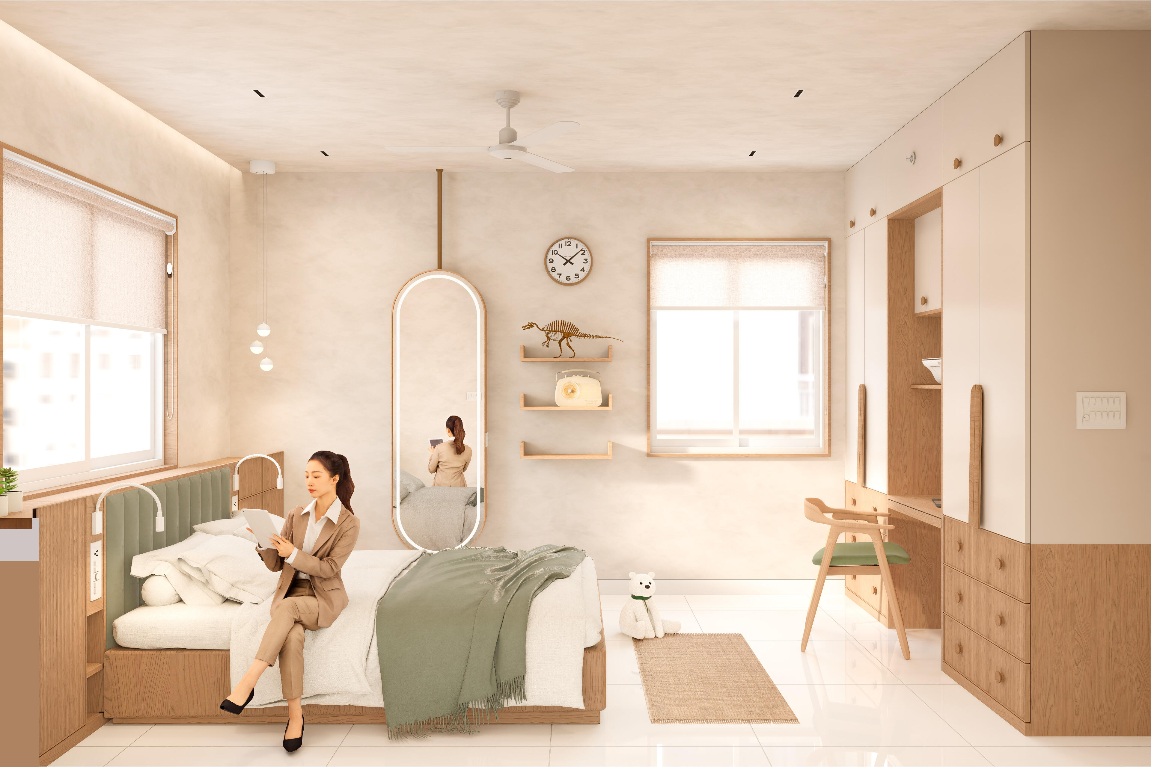A part of house designed to a perfect Boutique set up in pastal color tones with rustic floor and glinting accessories reflecting brand identity. The inviting design allows the visitors to take their time and feel comfortable while splurging in Shimmer Collection. This lively space also doubles up as a Guest Bedroom with element of surprise. The color tunable lights, pull out bed & hidden roller blinds do the transformation of a boutique into a bedroom.
