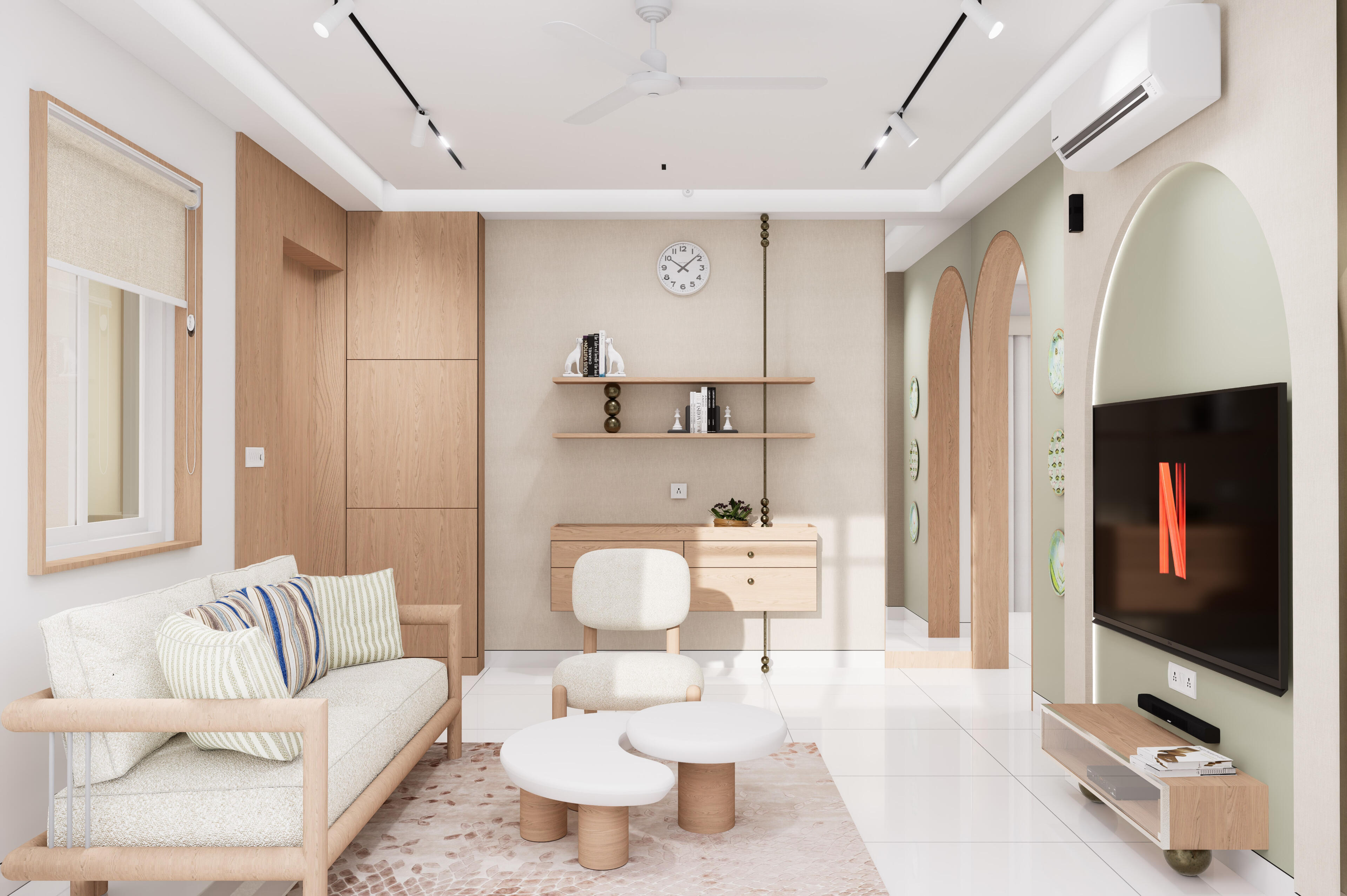 A 2 bhk apartment designed for an entrepreneur who wished for an upscale living with simplistic Scandinavian styled interiors. Overall approach was to keep the Norwegian color palette with very stylish furniture and lighting. Overall bright and clutter free space with wooden base tile and little splash of pop colors. The cement wall is created for as the main backdrop for living and allows to express the purity of space.