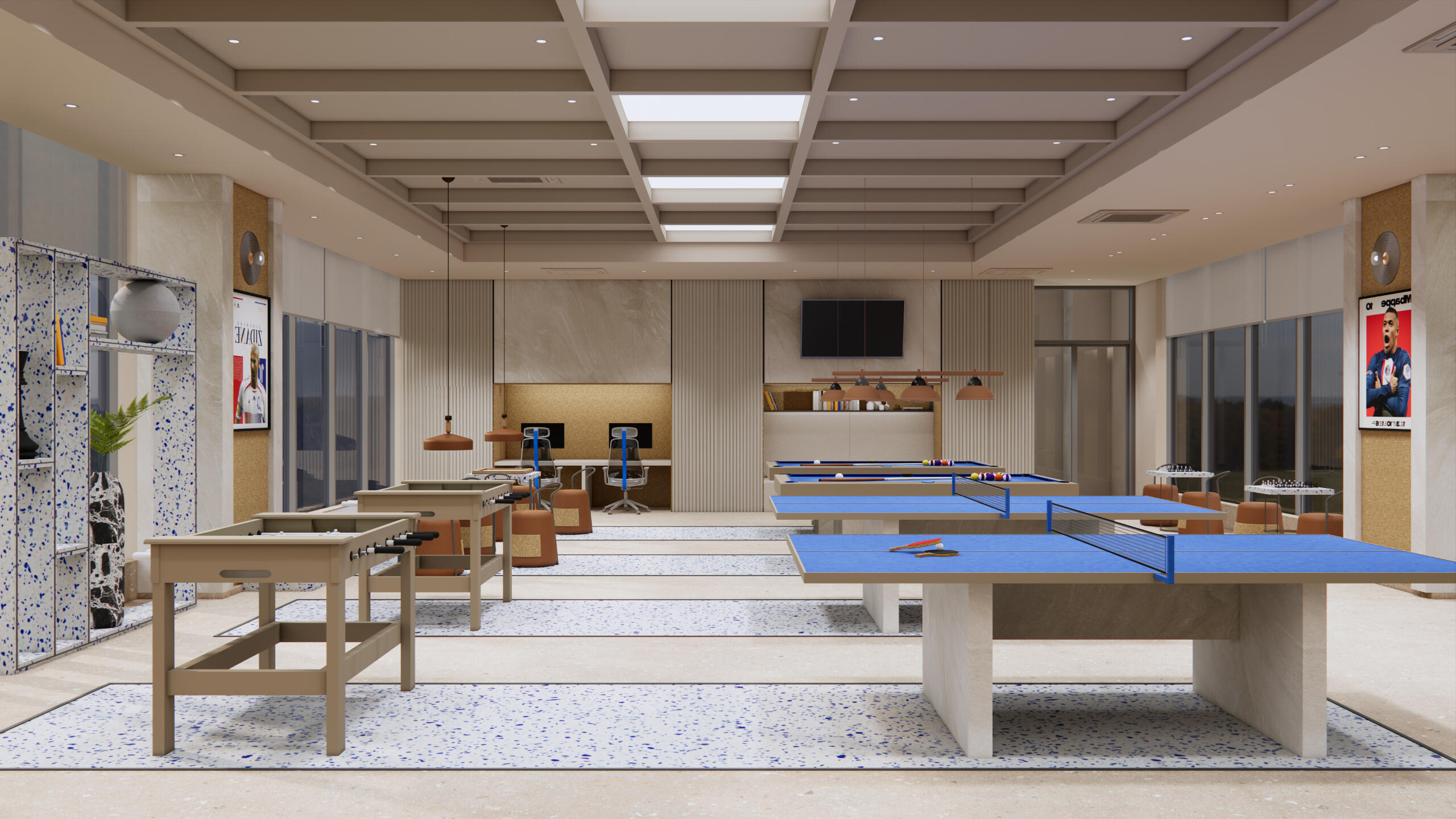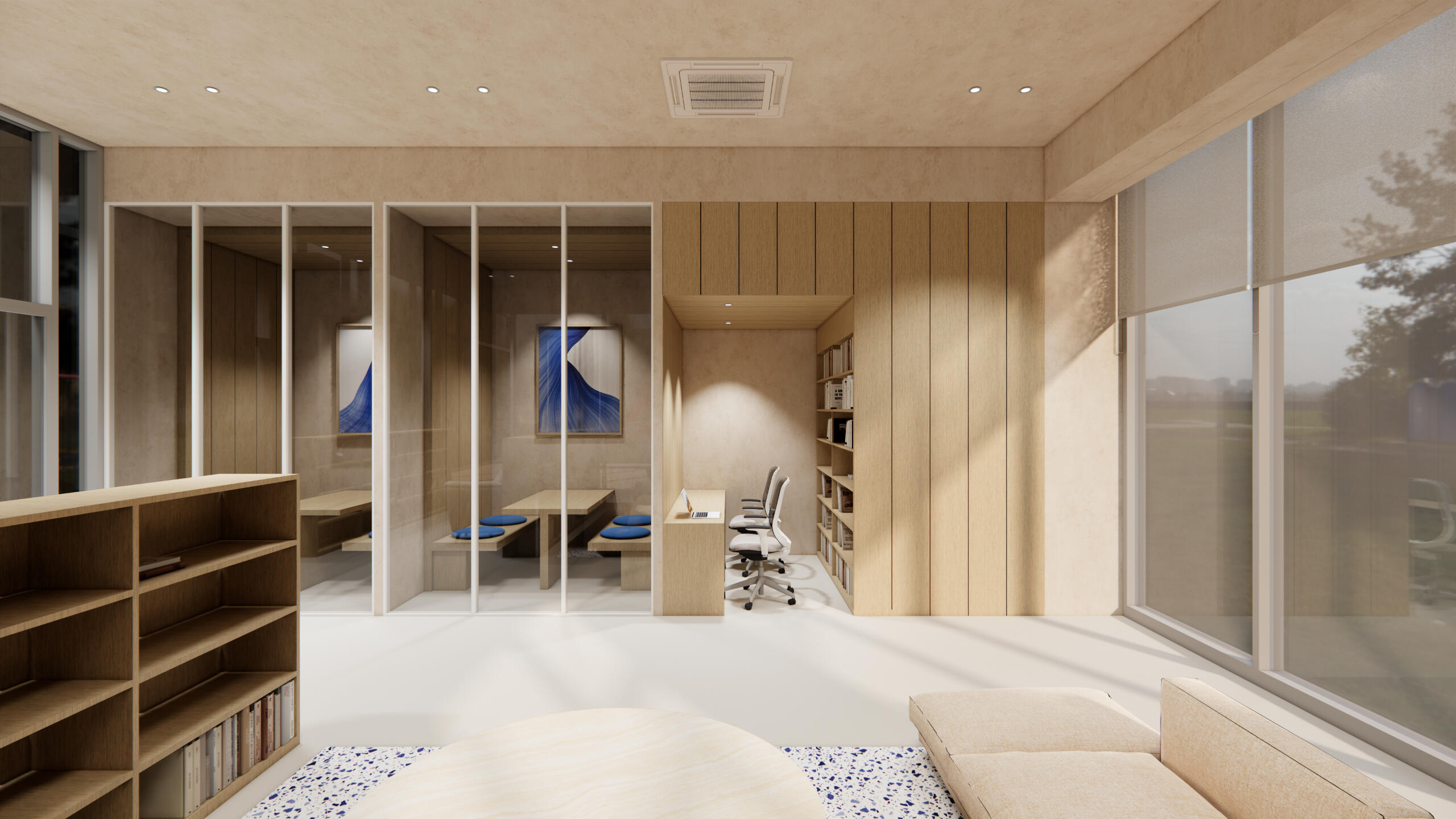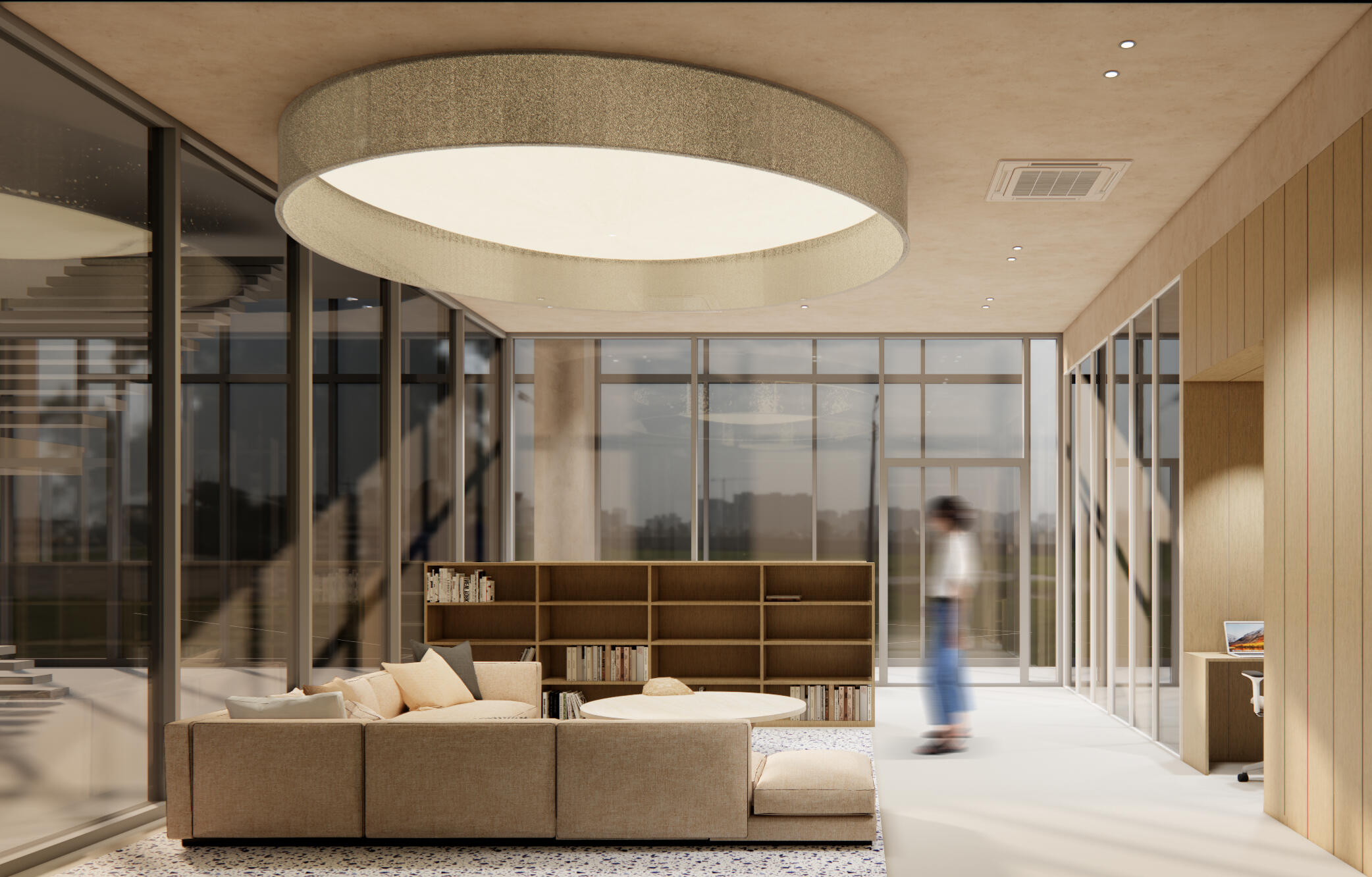 This design choice aims to conceptualize an environment that can be regarded as a hub for innovative ideas, which it is designed to provide. It encompasses the social, physical, psychological, and spiritual dimensions of its users. Ample windows throughout the area allow natural light to permeate the interiors, fostering a bright and open atmosphere that promotes productivity and enhances well-being. The connection to the exterior contributes to a lively ambiance.