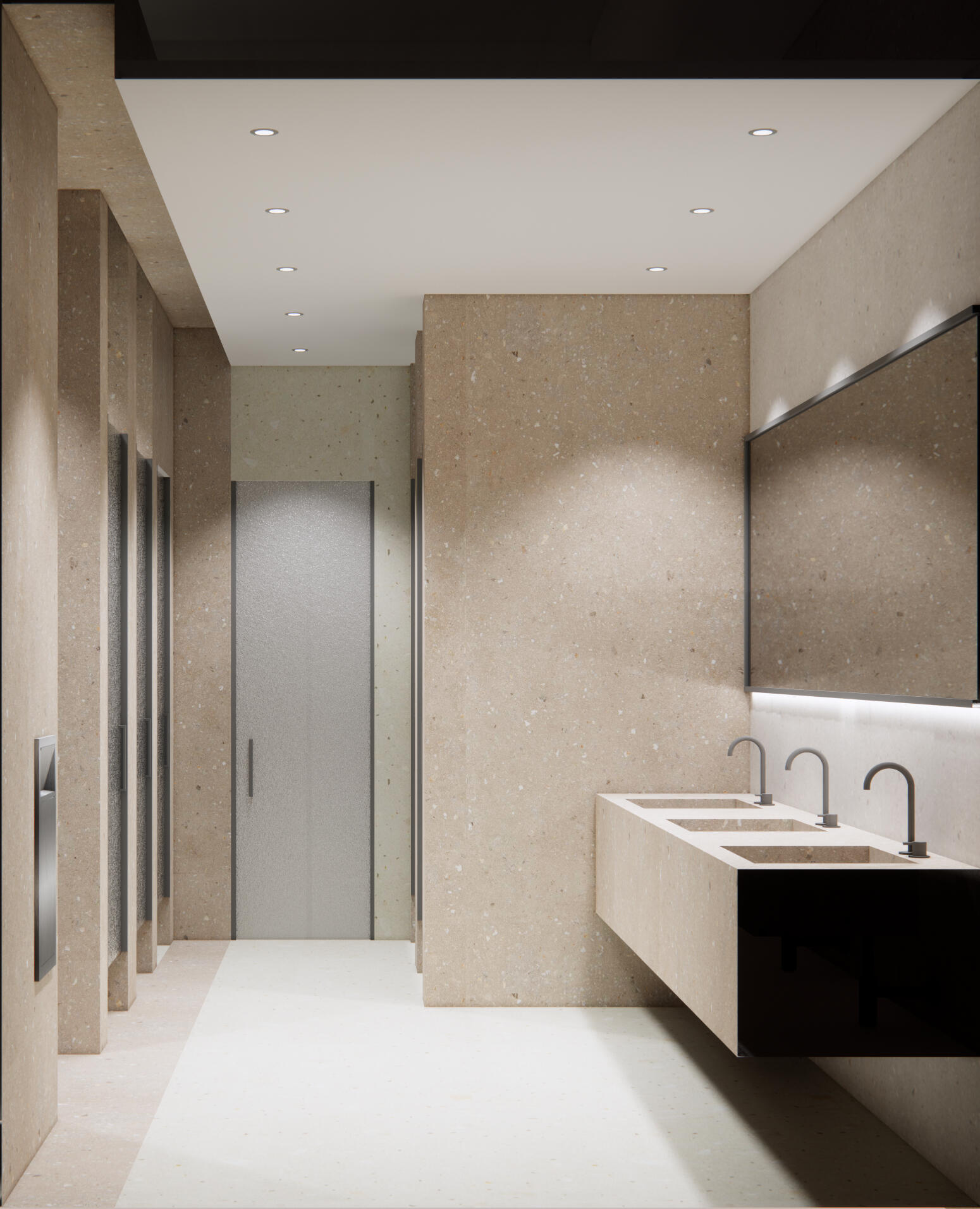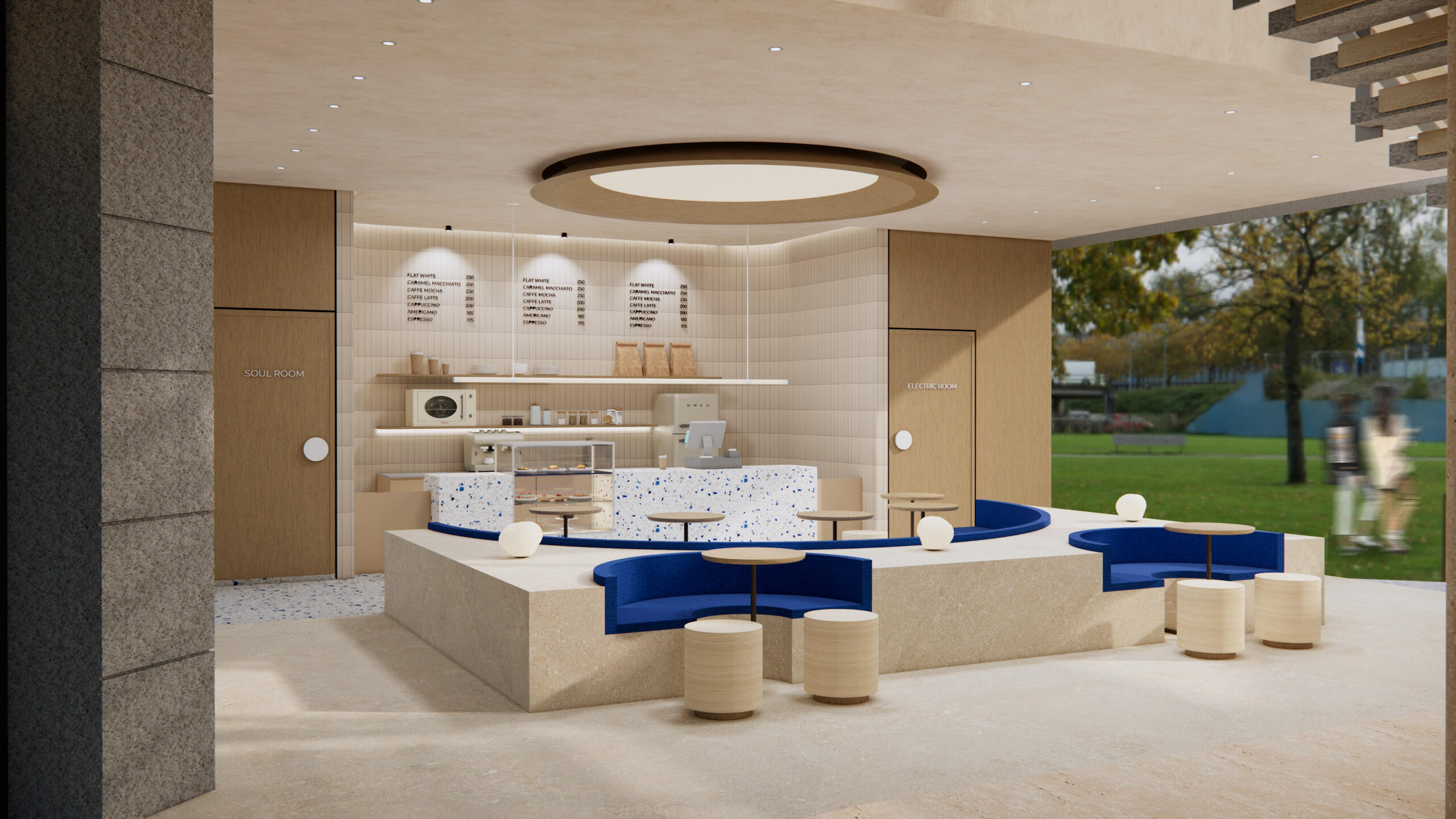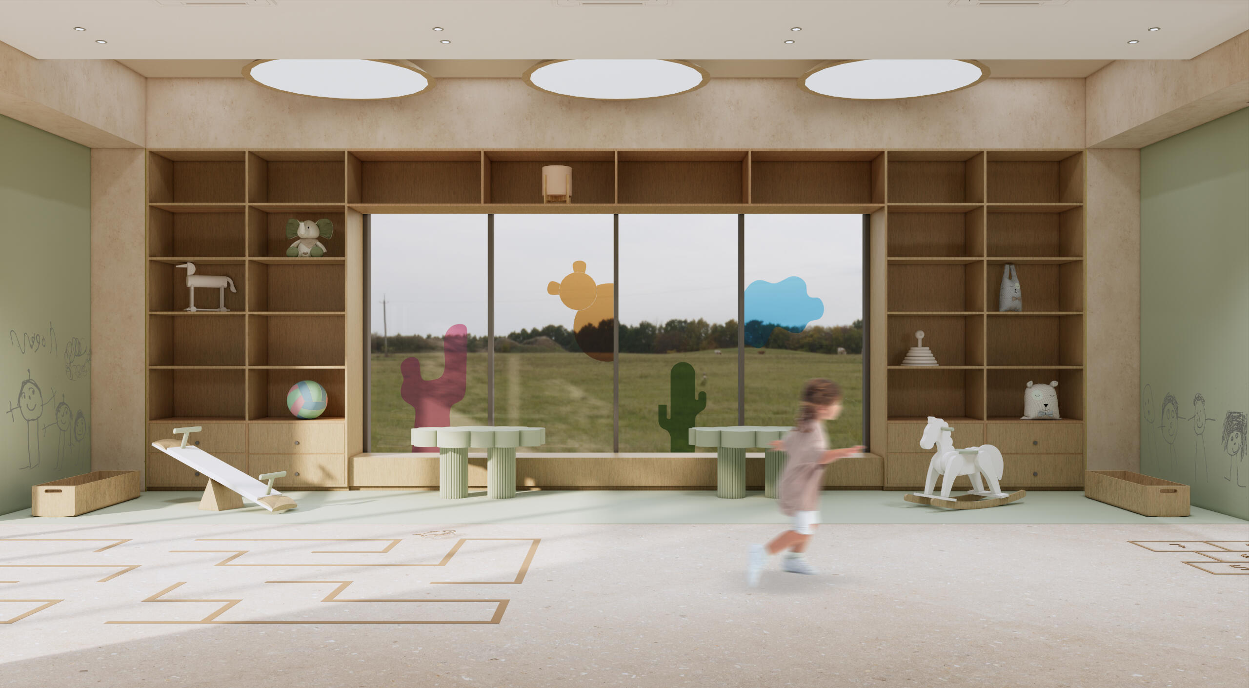 This design choice aims to conceptualize an environment that can be regarded as a hub for innovative ideas, which it is designed to provide. It encompasses the social, physical, psychological, and spiritual dimensions of its users. Ample windows throughout the area allow natural light to permeate the interiors, fostering a bright and open atmosphere that promotes productivity and enhances well-being. The connection to the exterior contributes to a lively ambiance.